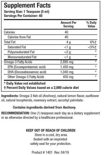 Biomega-3 Liquid™ provides omega-3 essential fatty acids (EFAs), sourced from a strategically-placed facility in the far South Pacific Ocean off the coast of Chile, guaranteeing the freshest raw material available, full traceability of the product, and unparalleled purity. Each teaspoon supplies 2,490 mg of EPA and DHA, as well as 405 mg of other omega-3 fatty acids. Natural lemon flavoring makes this product easy to enjoy.
